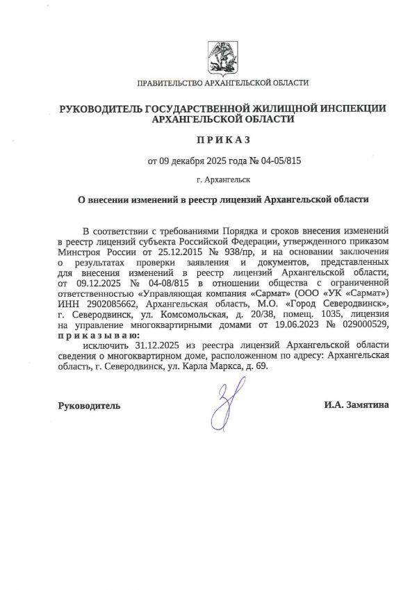 Приказ об исключении дома из лицензии